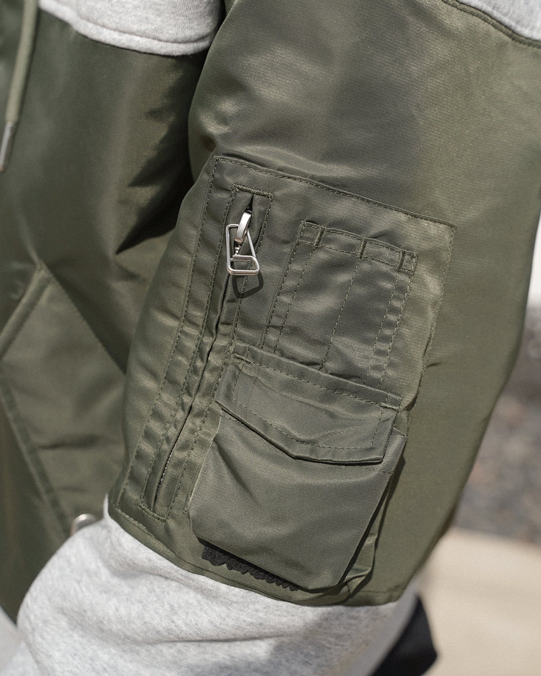 ・袖やフードなど切り替え部分にはナイロンツイル素材を使用し、程よい光沢感と立体的なデザインアクセントをプラス。