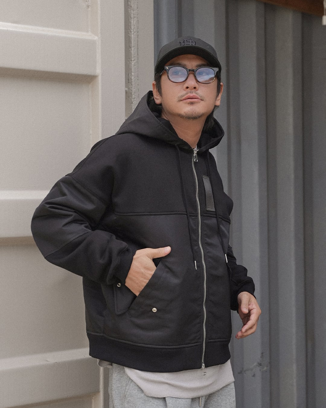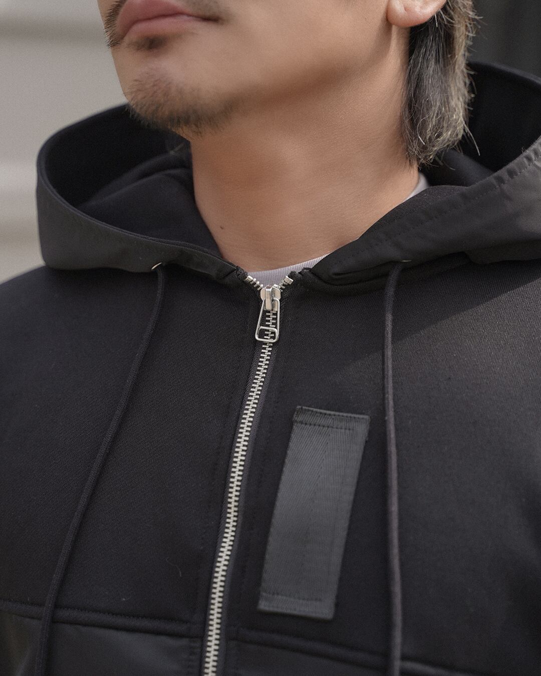 ・異素材の切り替えデザインが印象的なフルジップパーカー。