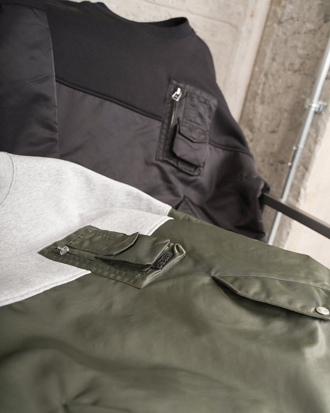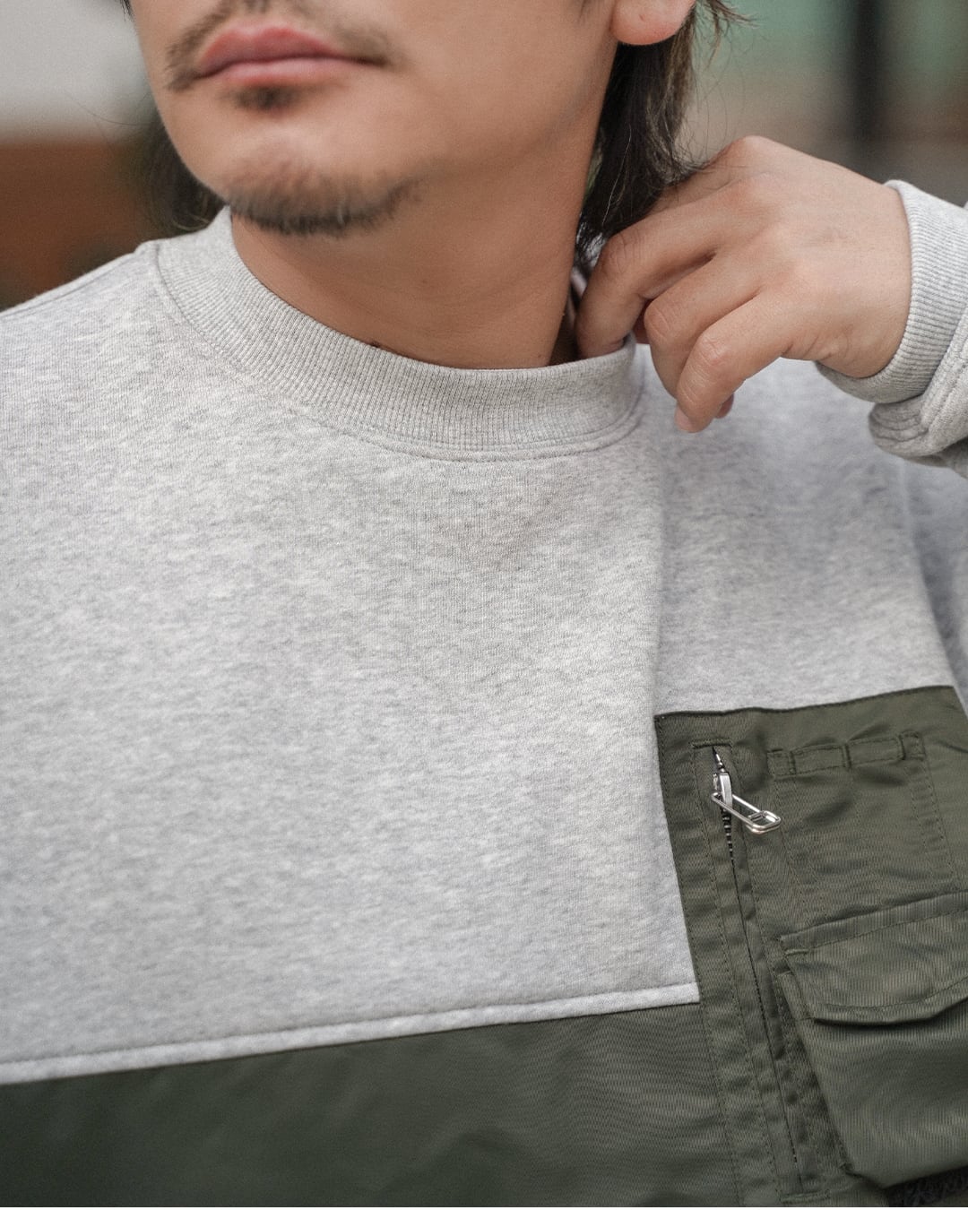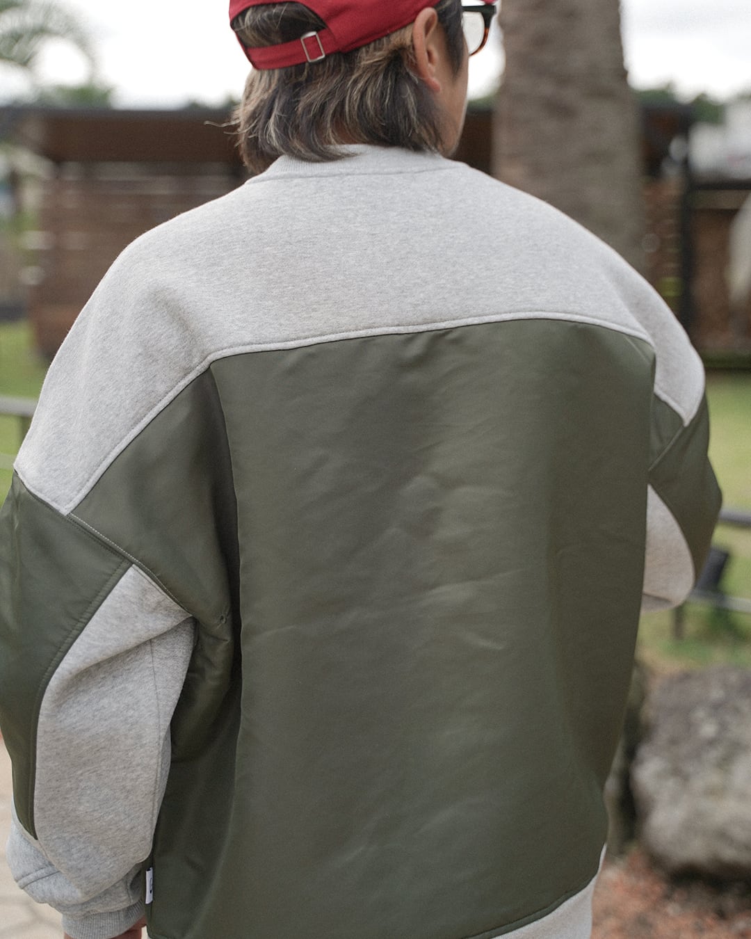 ・異素材を組み合わせた切り替えデザインが印象的なスウェットトレーナー。