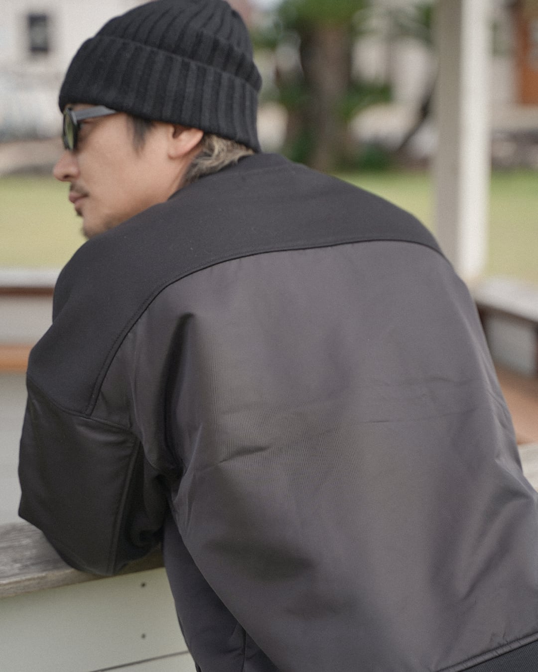 ・袖や切り替え部分にはナイロンツイル素材を使用し、程よい光沢感と立体的なデザインアクセントをプラス。