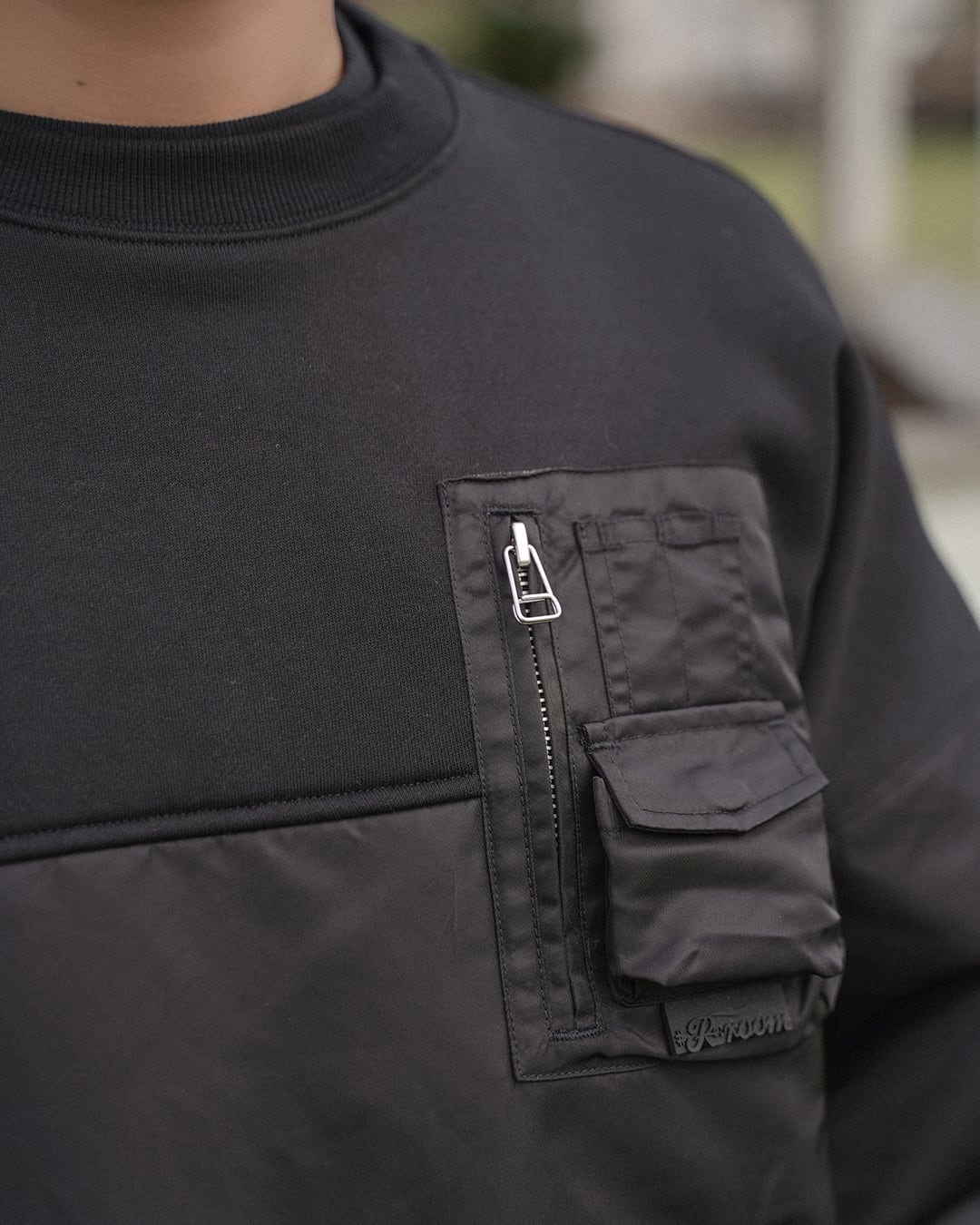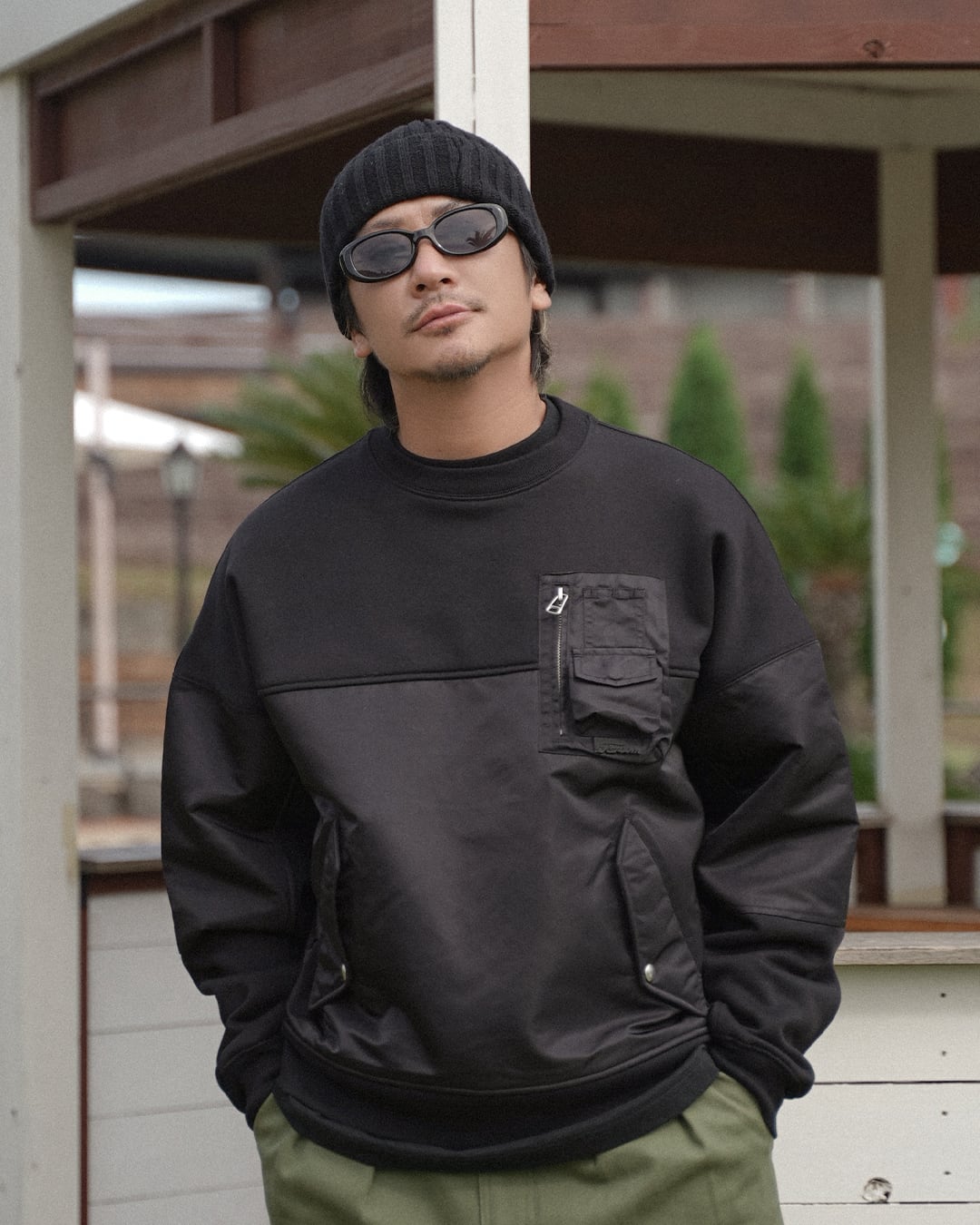 ・異素材を組み合わせた切り替えデザインが印象的なスウェットトレーナー。