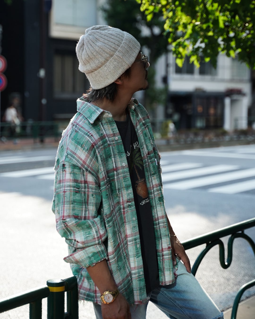 ・一見クラシックなチェックながら、全体に迷彩調の柄を落とし込むことで、ミリタリー感とストリート感を兼ね備えた一枚。