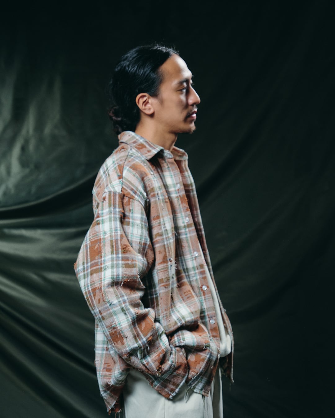 ・一見クラシックなチェックながら、全体に迷彩調の柄を落とし込むことで、ミリタリー感とストリート感を兼ね備えた一枚。