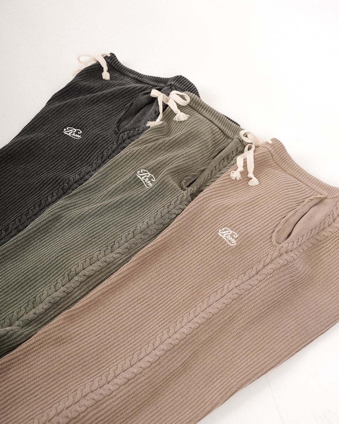 ・ウエストはゴム仕様で、平紐のドローコード付き。サイズ調整がしやすく快適な履き心地。