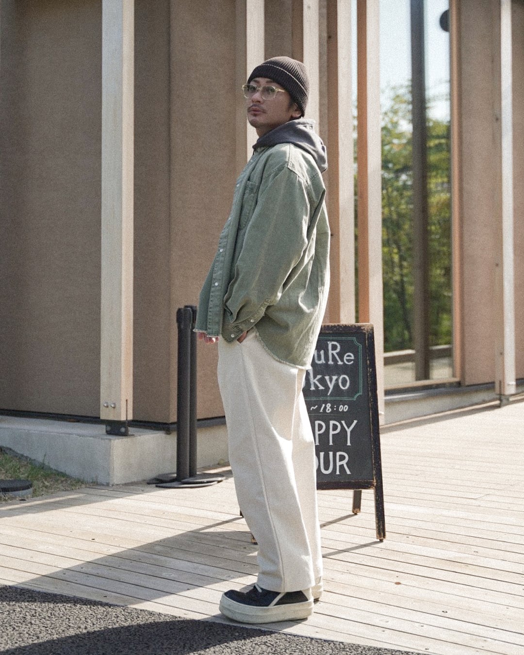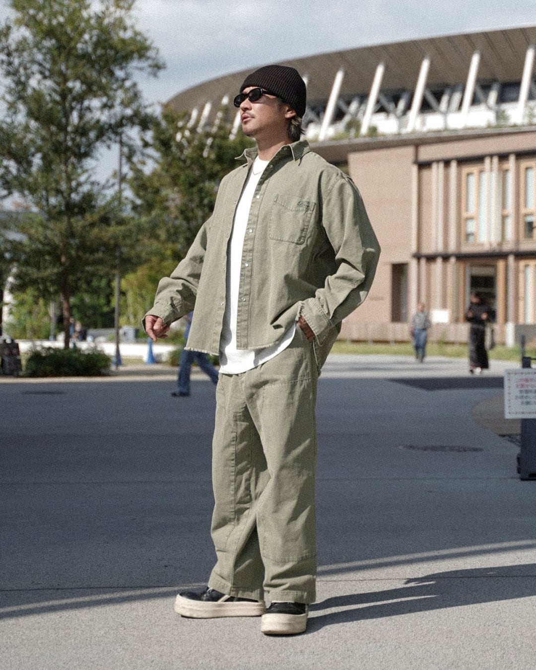 ・同生地を使用した「VINTAGE WASHED COLOR TUCK WIDE PANTS」とのセットアップスタイルも可能。