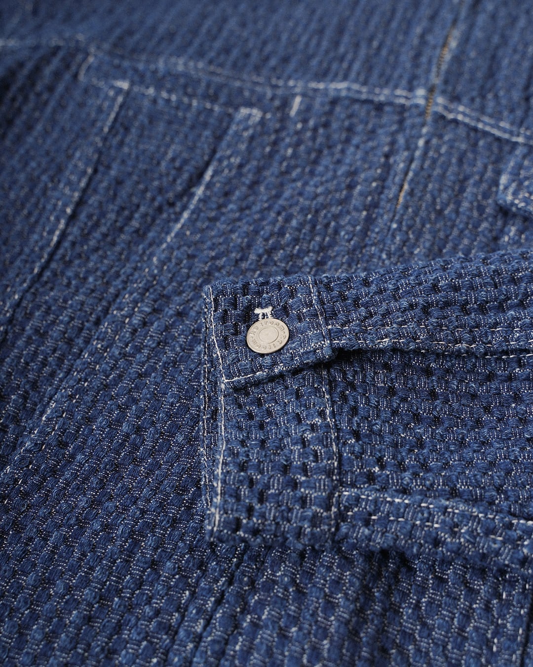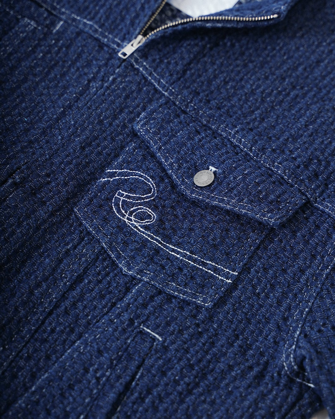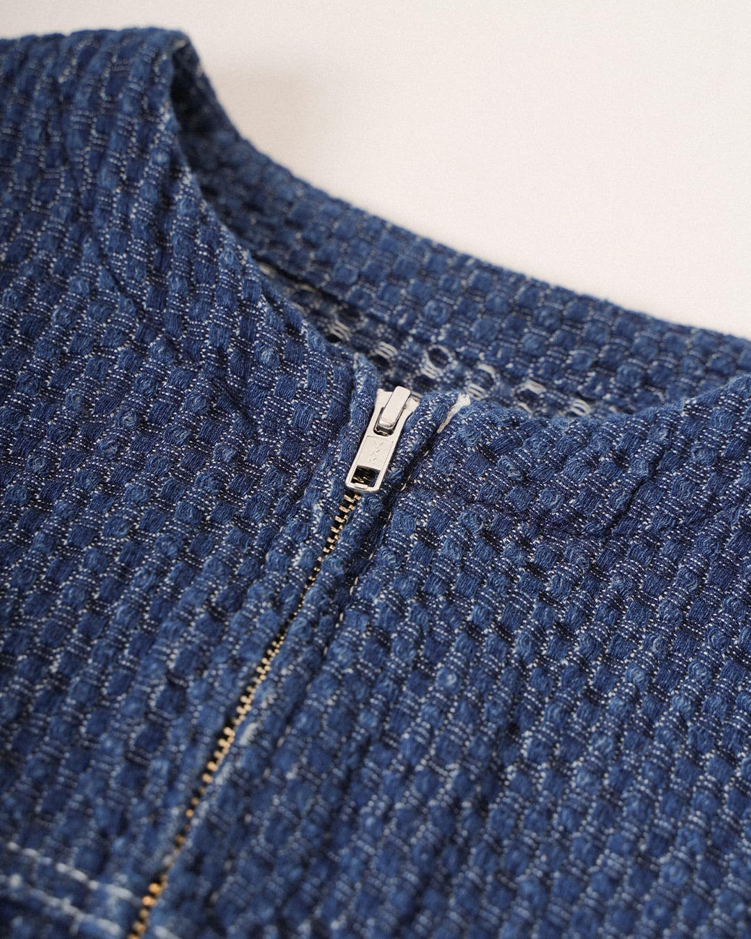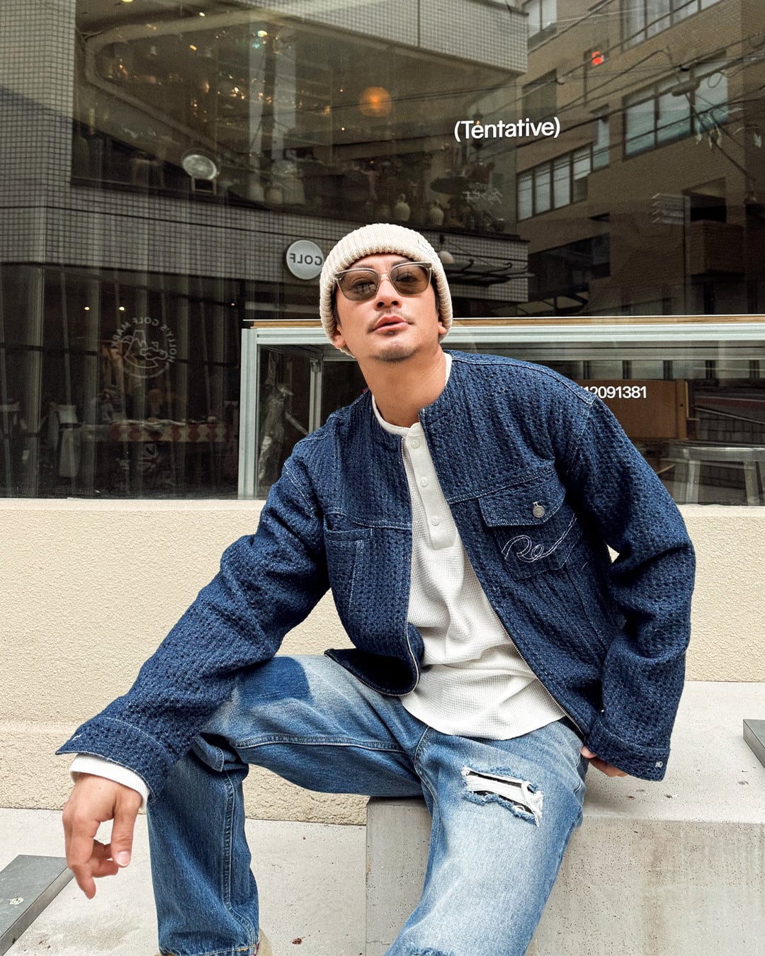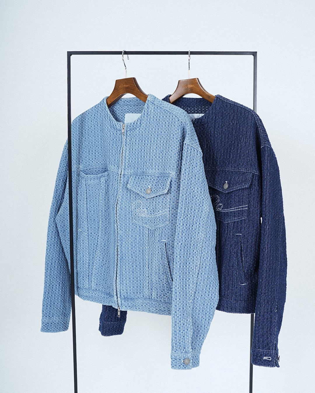 ・ノーカラーデザインで、すっきりとした印象に仕上げたデニムジャケット