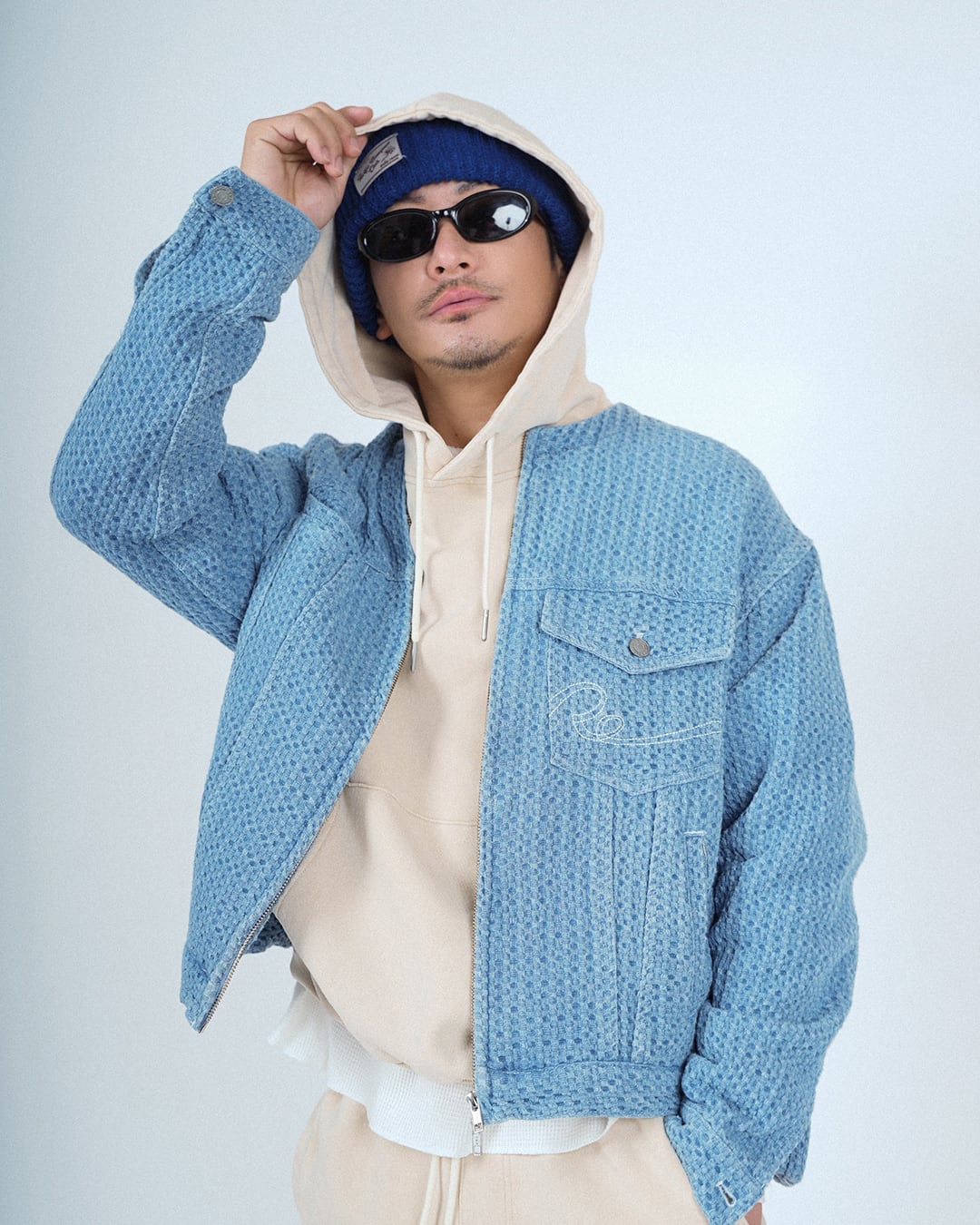 ・ノーカラーデザインで、すっきりとした印象に仕上げたデニムジャケット