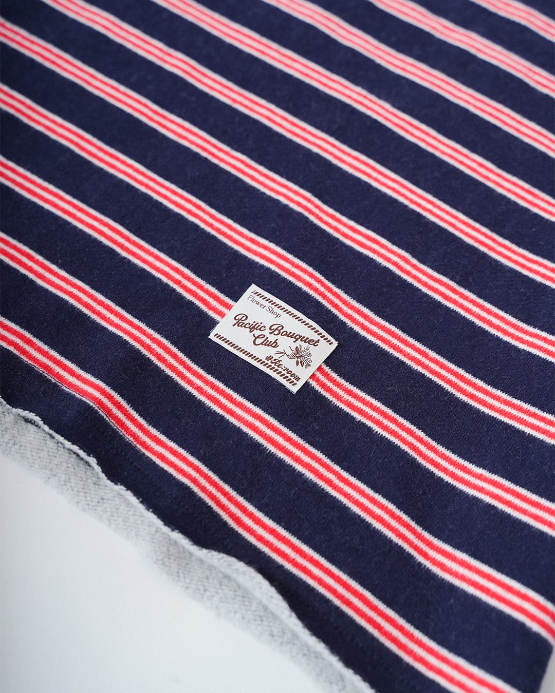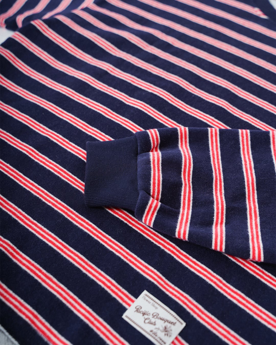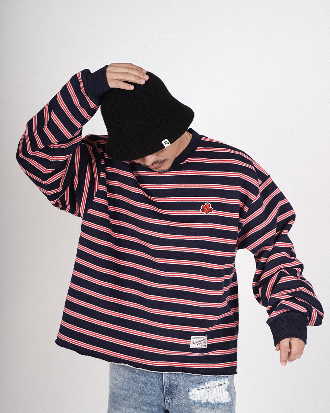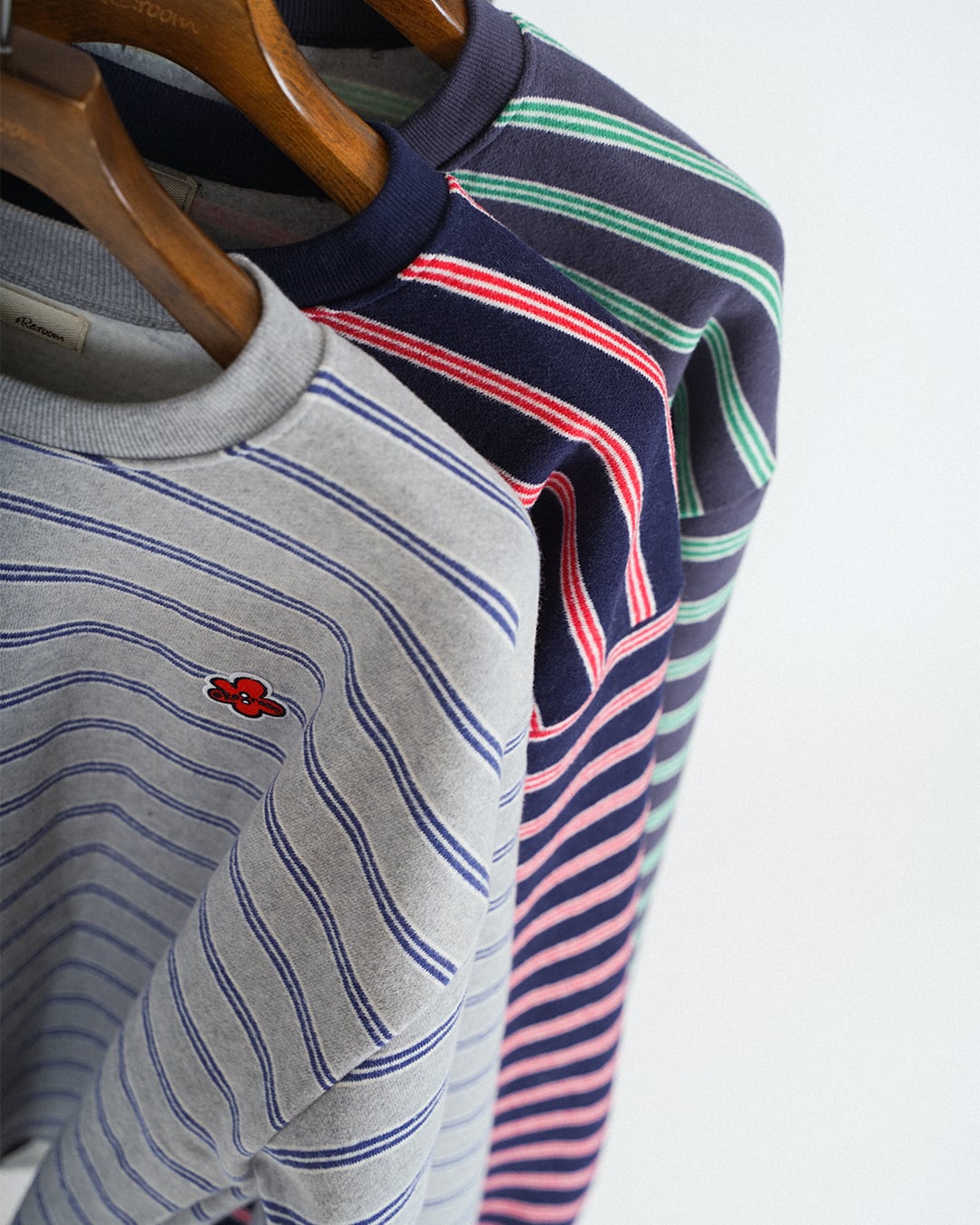 ・カットオフ仕様のボーダーデザインが目を引くスウェットトレーナー
