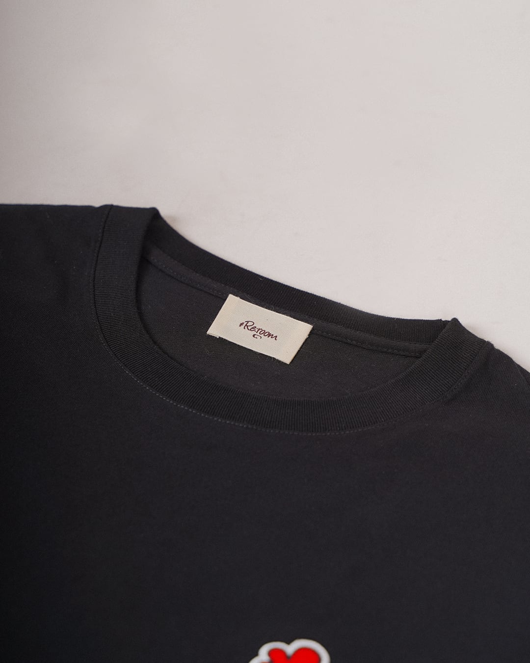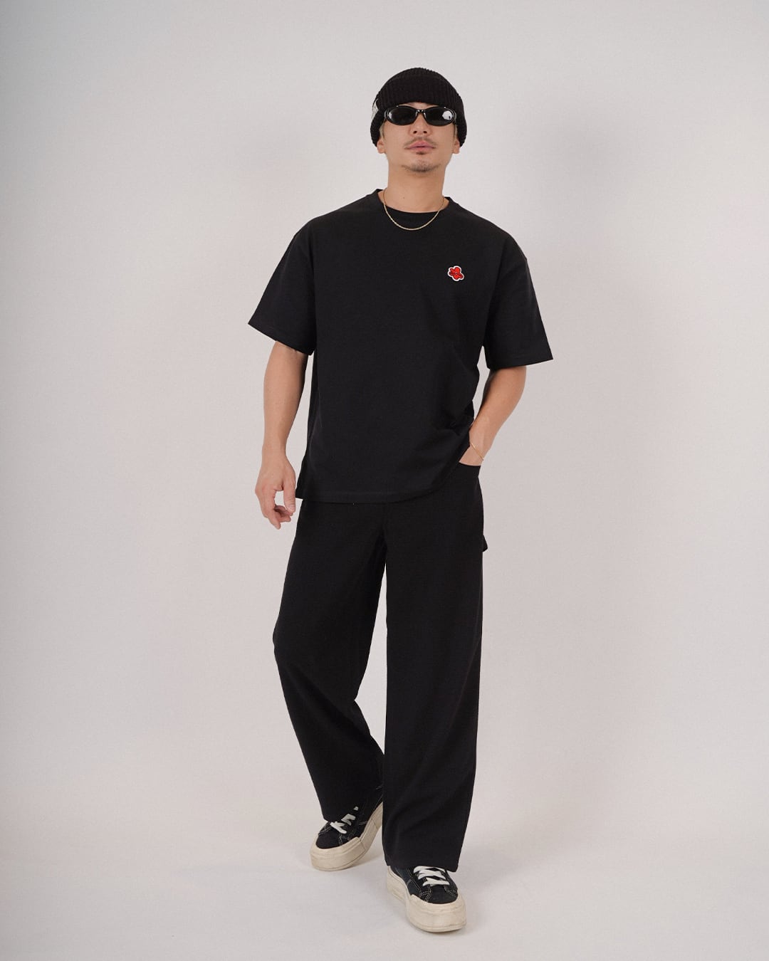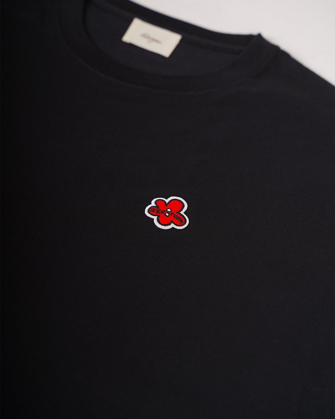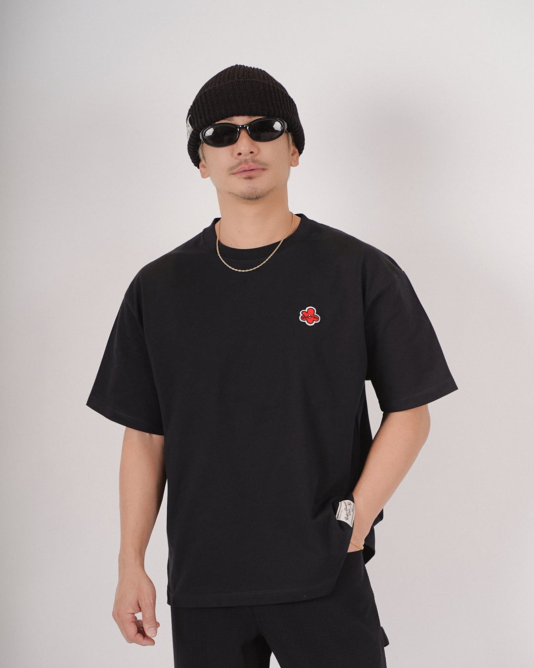 ・フロントにフラワーアイコンのワッペンを施したTシャツ