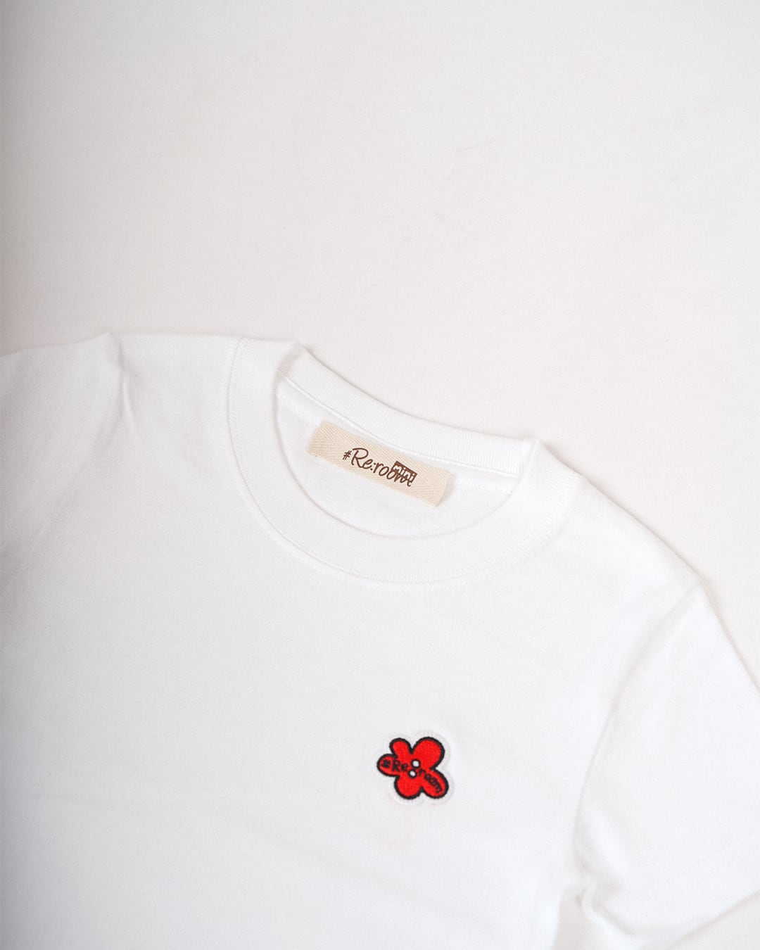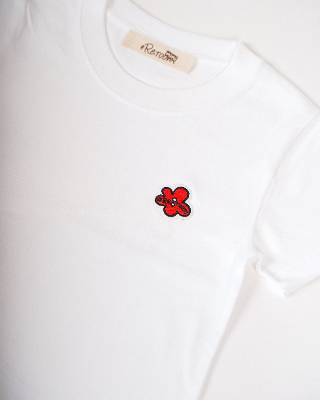 ・フロントにフラワーアイコンのワッペンを施したキッズTシャツ
