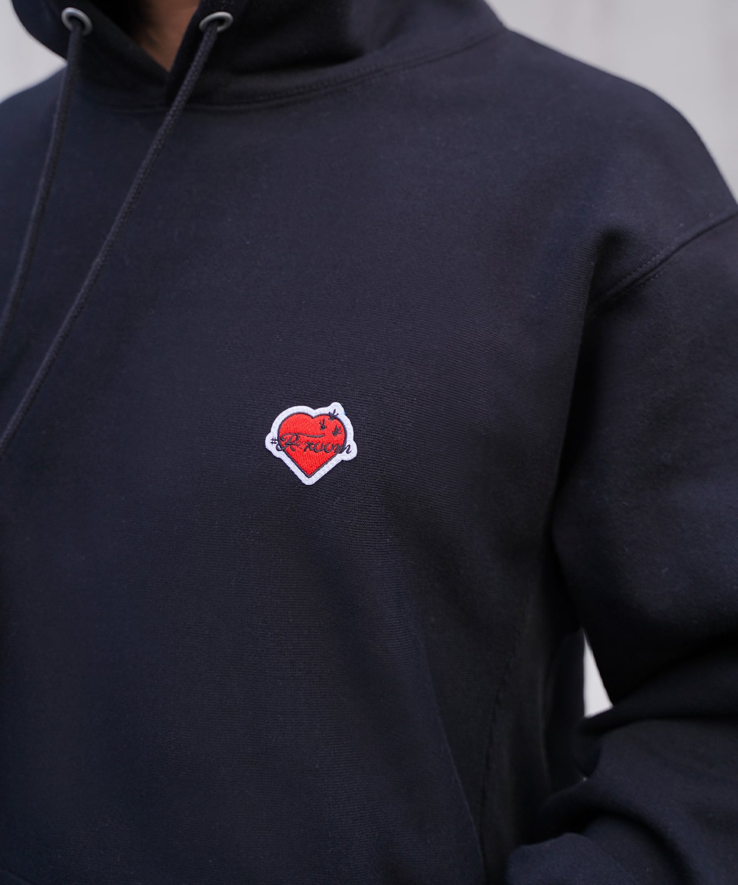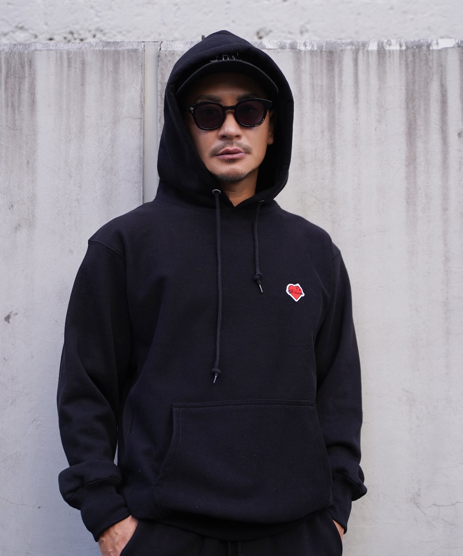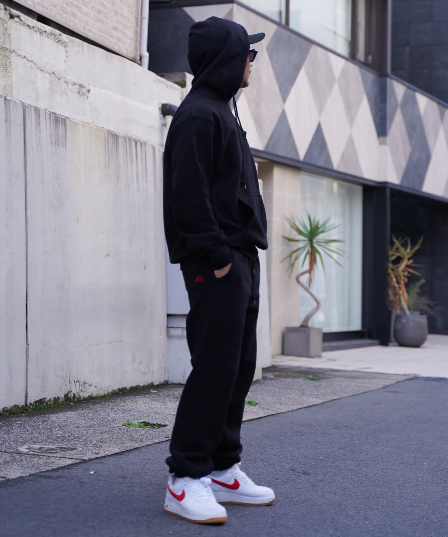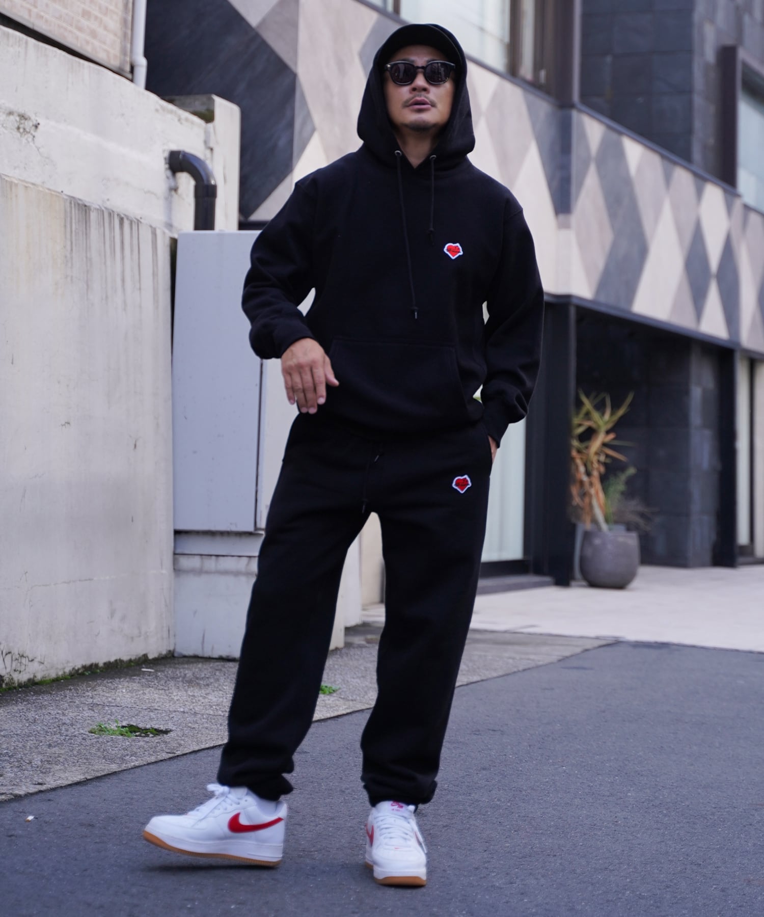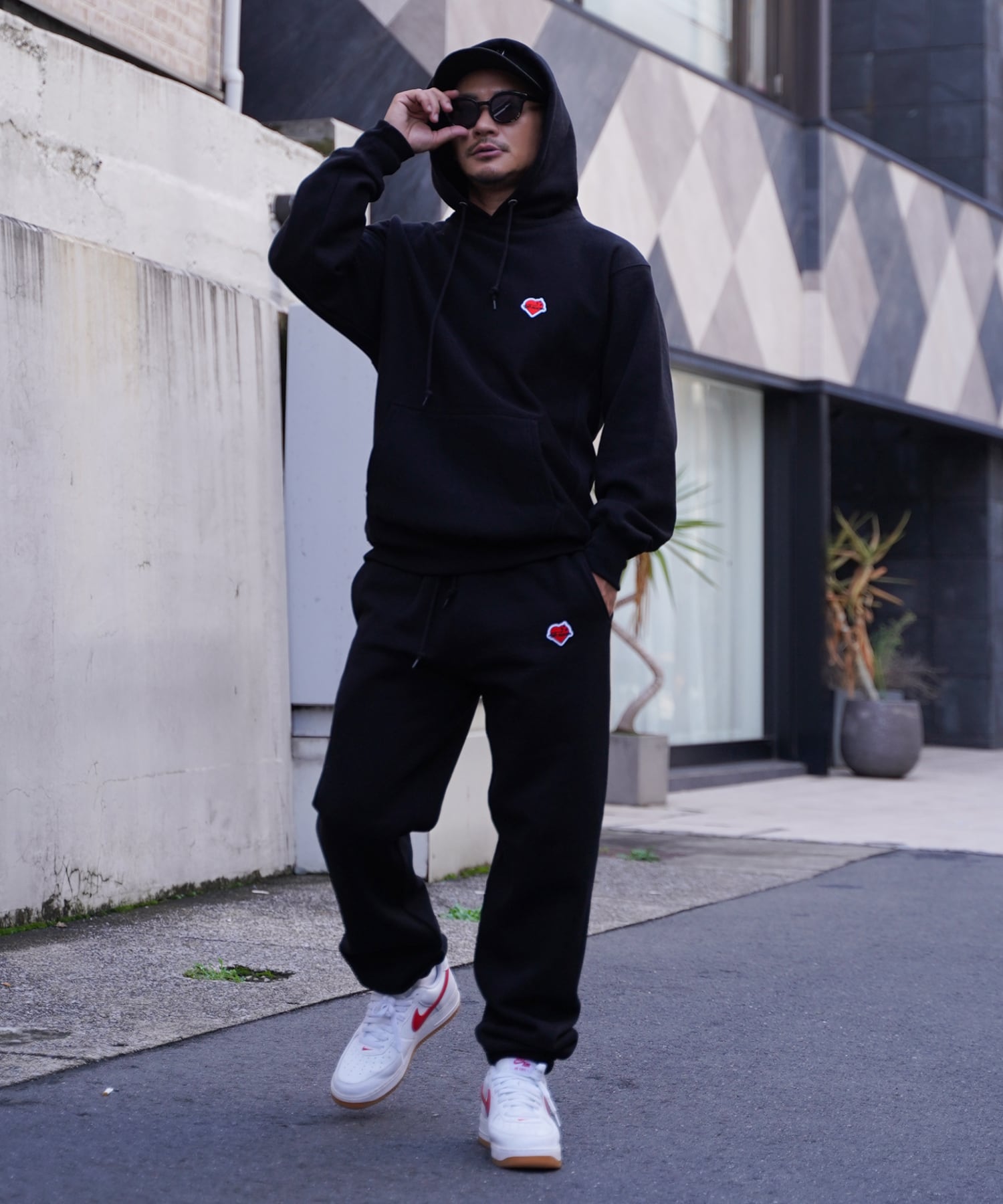・同生地を使用したハートアイコンワッペンスウェットパンツとセットアップでの着用もおすすめ。