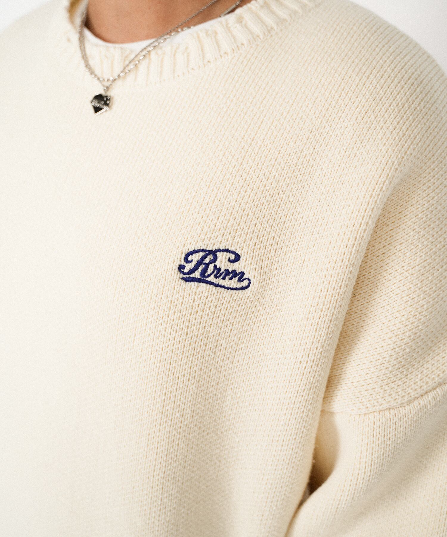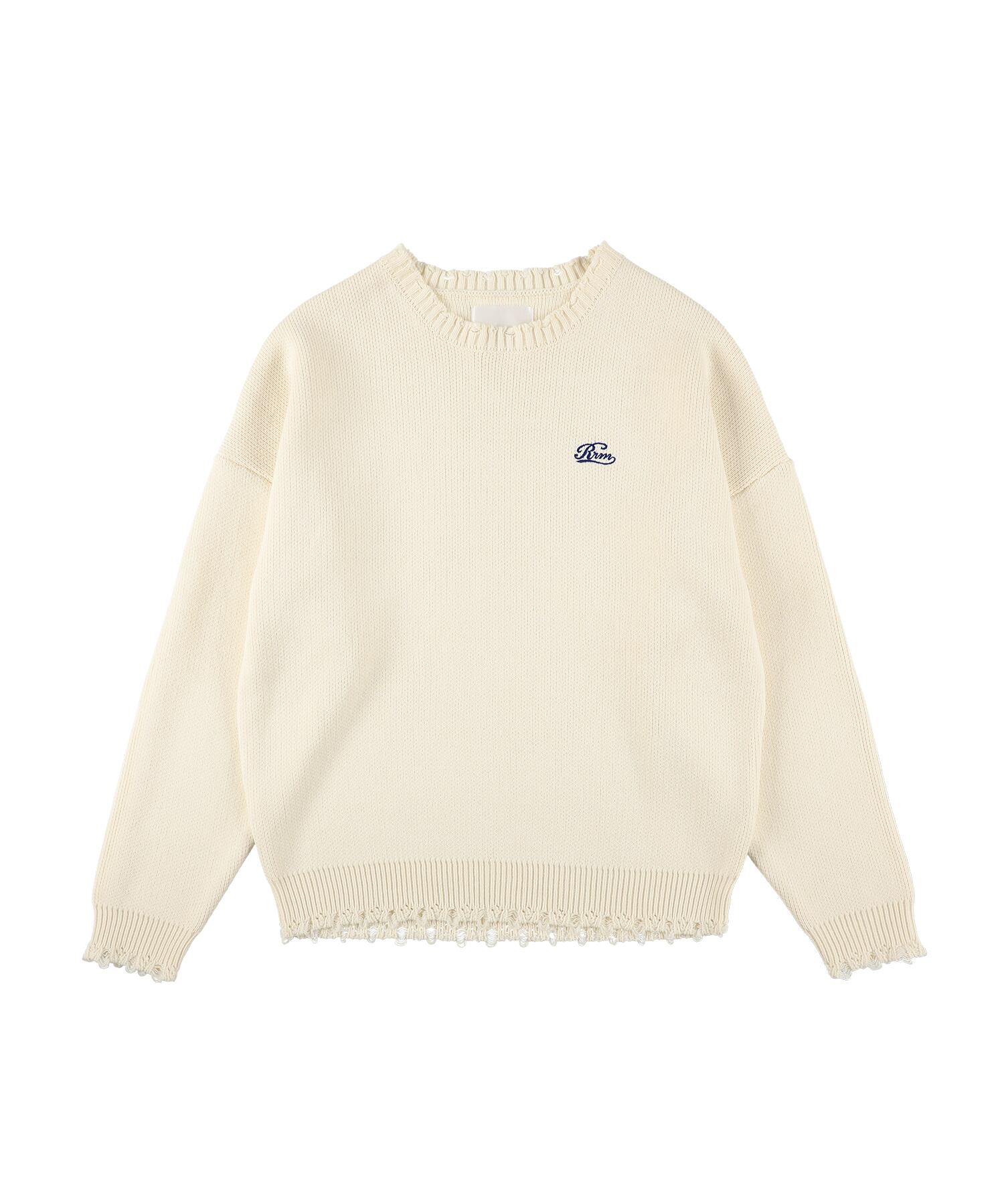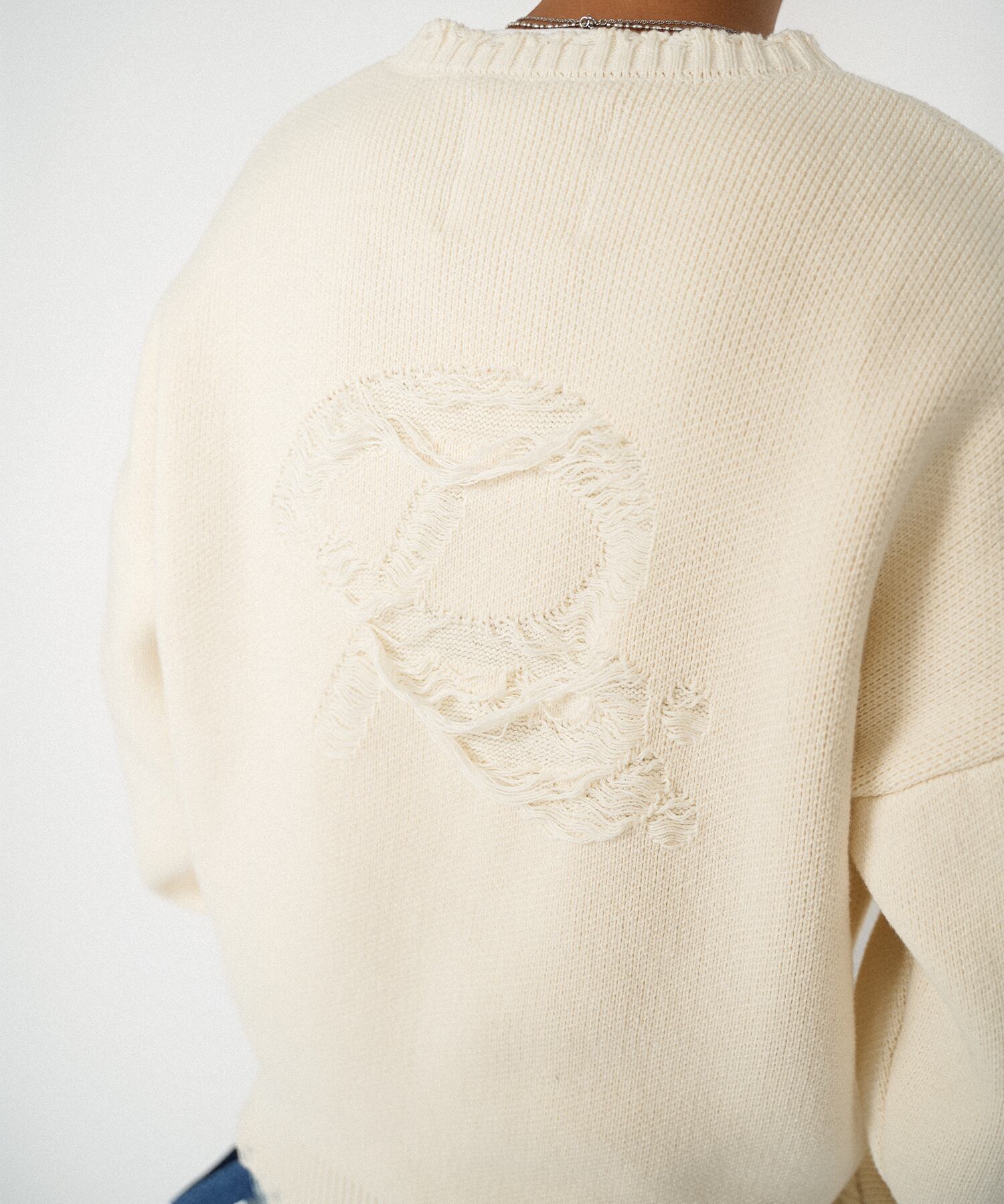 ・バックにダメージデザインのブランドアイコンが施されたクルーニット。