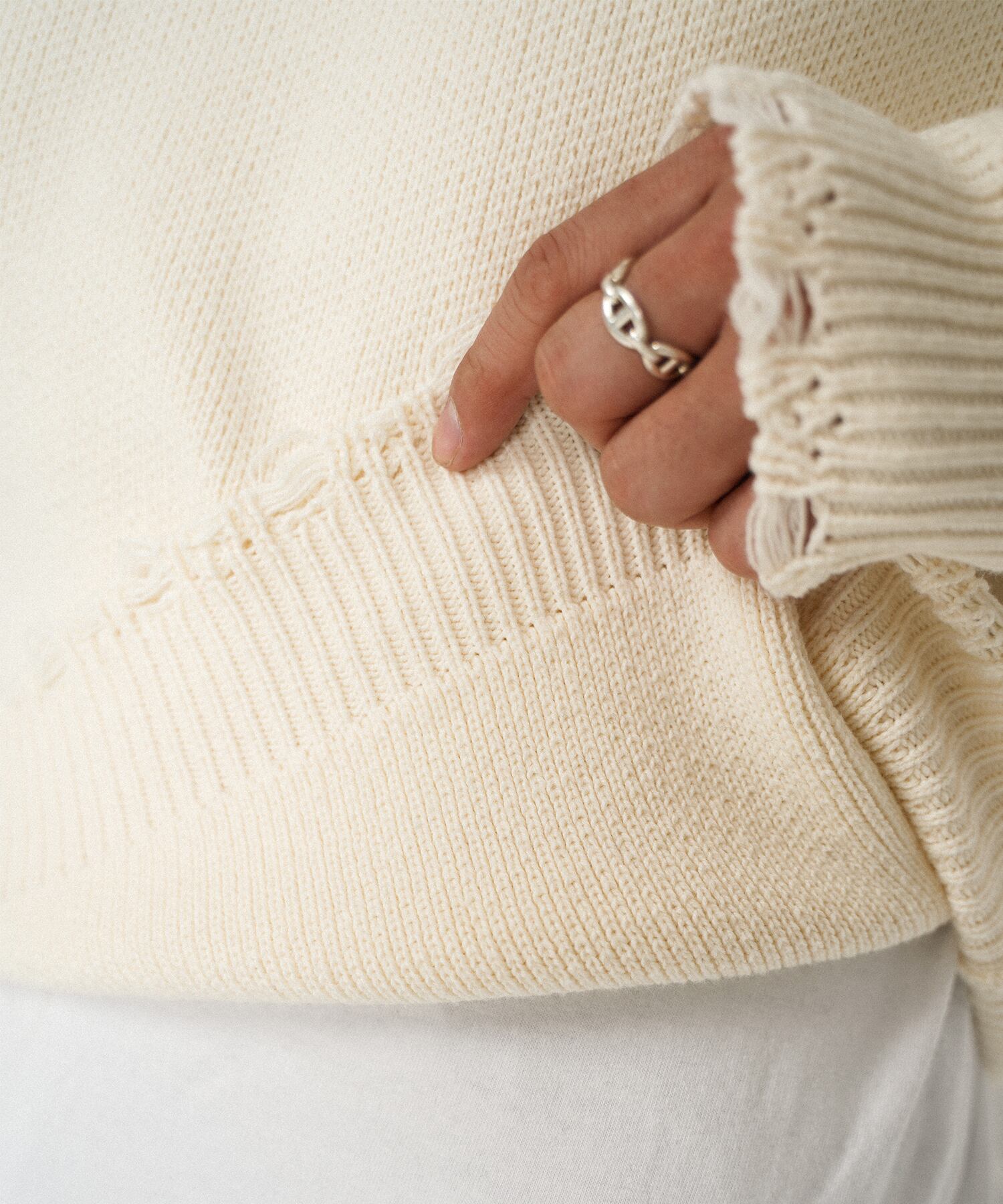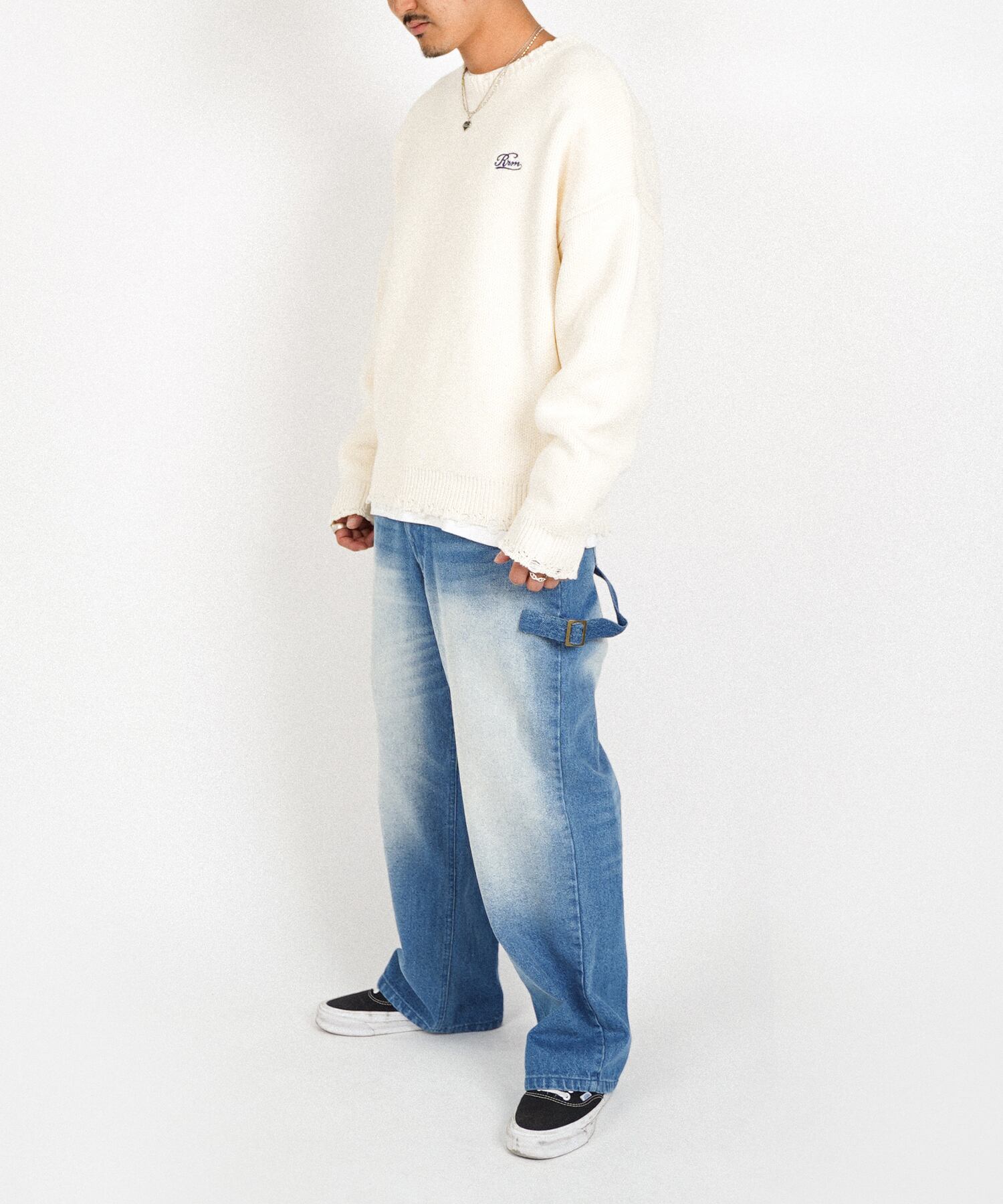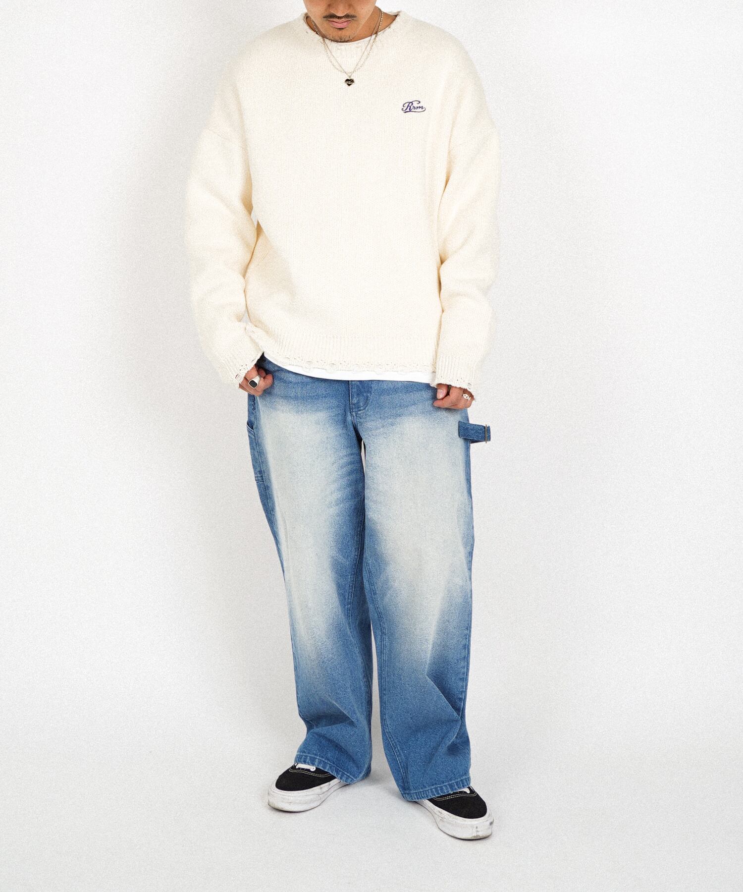 ・バックにダメージデザインのブランドアイコンが施されたクルーニット。